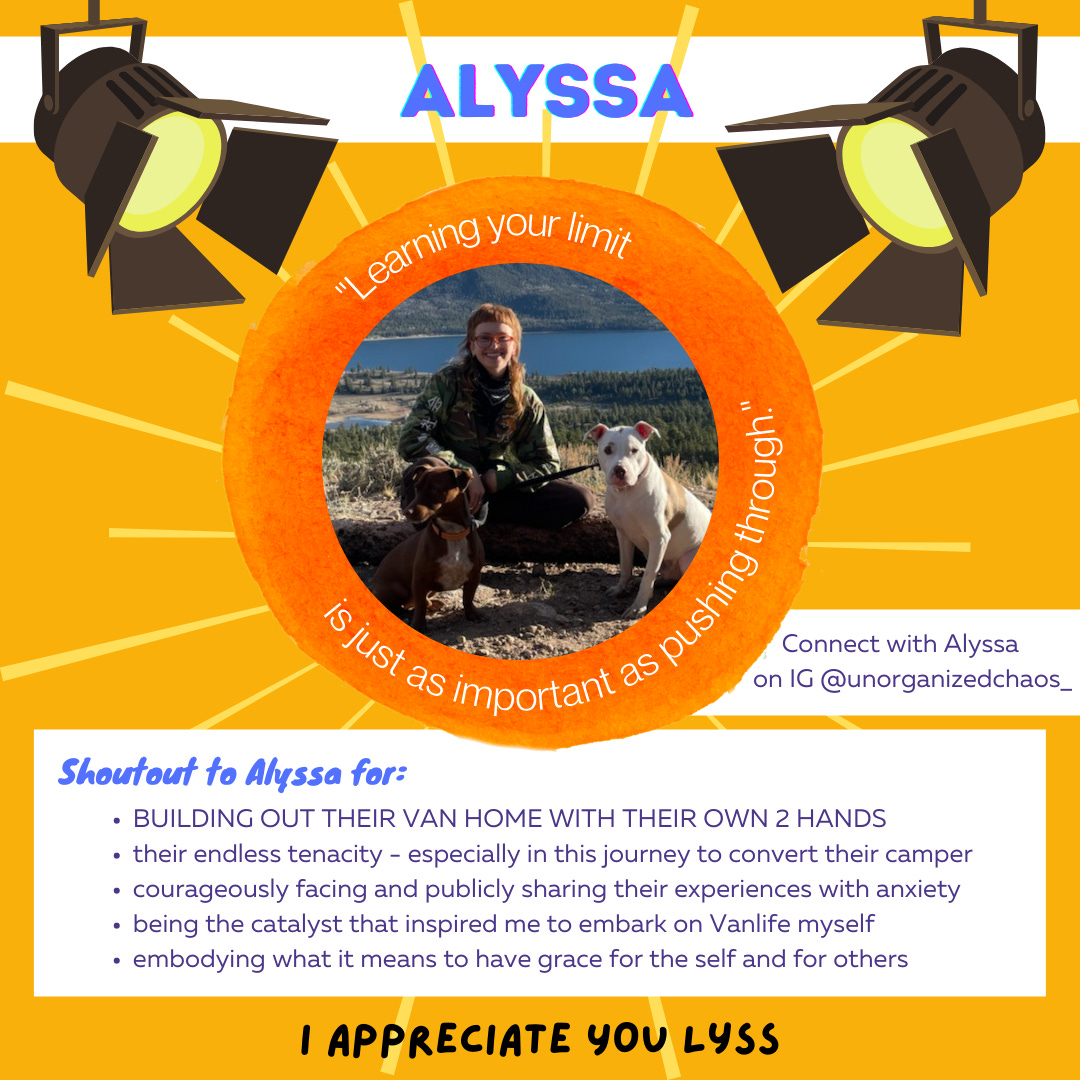 And I gotta say a word about Alyssa’s PERSISTENT spirit! They have had so many false starts, mechanical difficulties, tows… they even had to get a whole new van after realizing Stella the RV was not going to work out. Most people I know would say, “This is the Universe telling me no” and give up. I love that Alyssa took those challenges with grace and used it as fuel for their excitement. They have been a living example of what it looks like to be committed to your dreams.